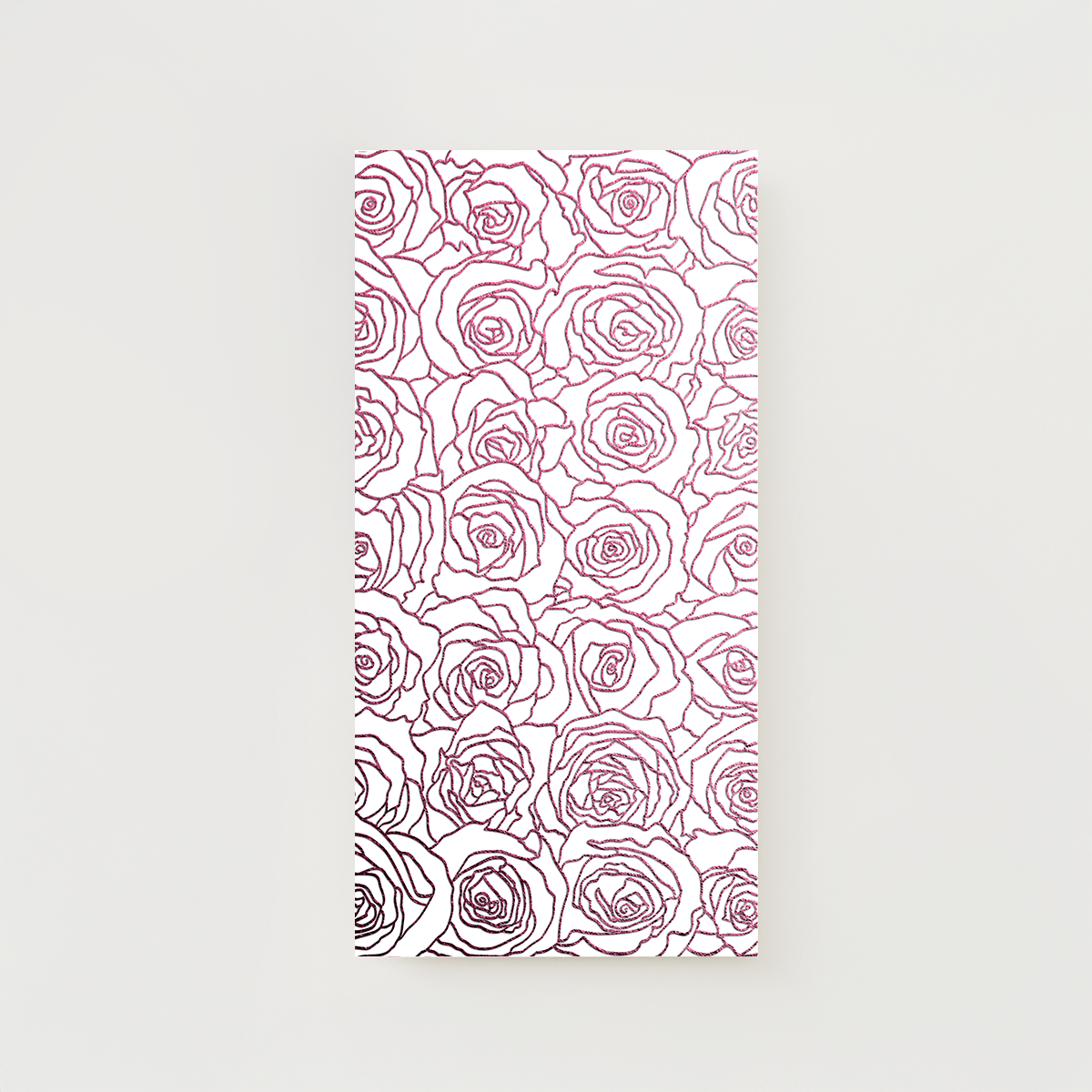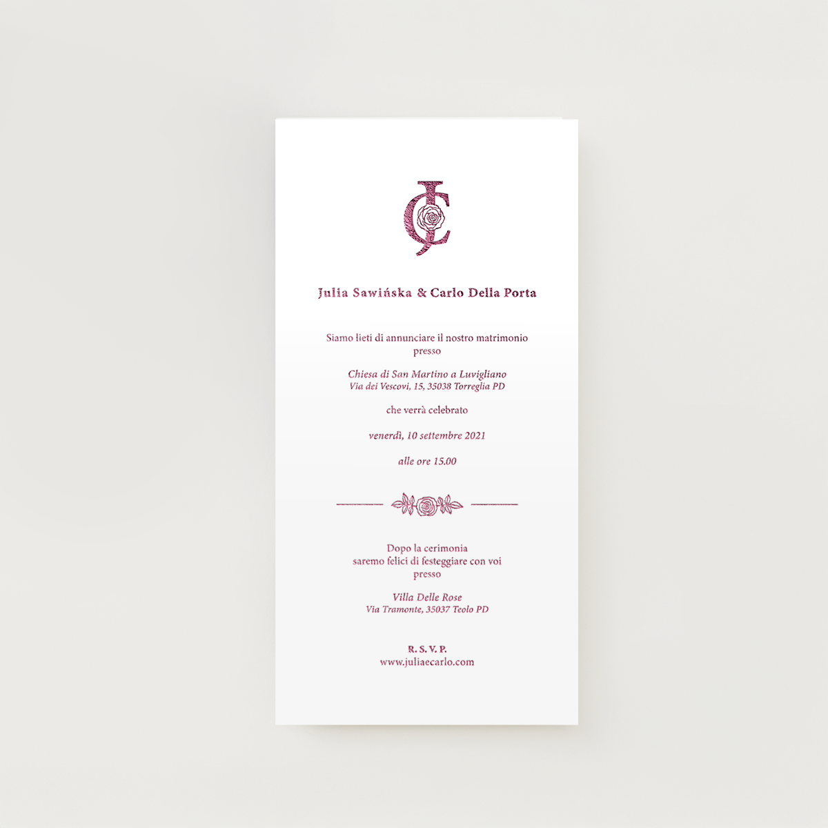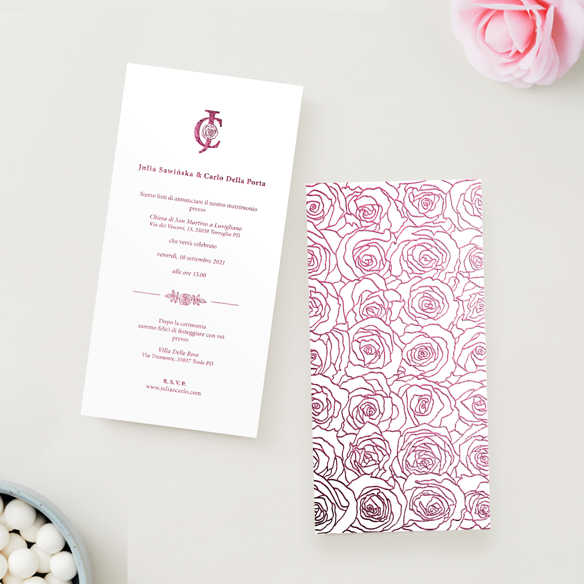 Inviti e coordinati con motivo rosa. Formato stampa: 11 × 21 cm. Effetto foil lucido a caldo disponibile in oro, argento o colori personalizzati. Nell’esempio mostrato sul sito è visibile il colore rosa. Tutte le stampe sono realizzate fronte e retro su carta premium (216–270 gsm) o carta deluxe (300–350 gsm), con finiture a scelta: opaca (matte finish), lucida (gloss finish) o non patinata (uncoated finish). Puoi scegliere tra angoli squadrati o angoli arrotondati, per uno stile davvero unico. Le buste personalizzate possono essere aggiunte su richiesta: in alternativa, ogni creazione viene consegnata con una busta classica inclusa.