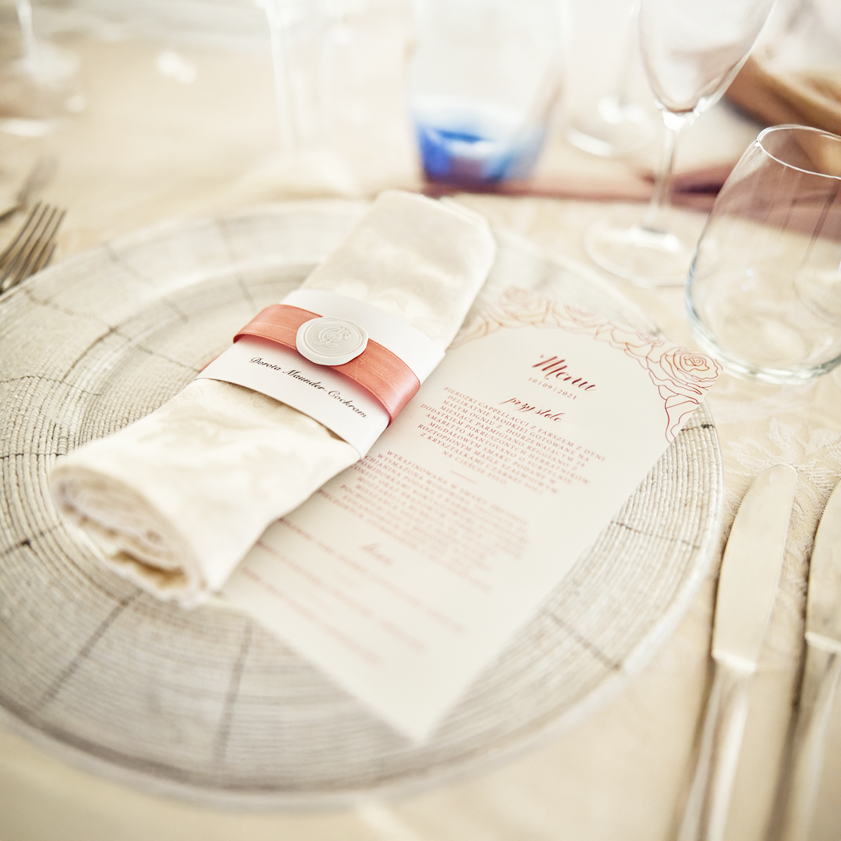 Segnaposto con motivo a rosa. Il segnaposto è composto da una fascia di carta con nome e cognome dell’ospite, arricchita da un nastro elegante e rifinita con un sigillo personalizzato con la grafica dell’evento.